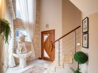 Step inside to a grand entryway defined by soaring high ceilings and a bespoke wooden entrance door, setting a tone of refined elegance. A contemporary staircase, featuring stainless steel and wood, ascends gracefully, while abundant natural light floods the space through large windows. The open-plan living areas are designed for both lavish entertaining and serene relaxation, boasting recessed lighting, crown molding, and durable tiled flooring that extends throughout.