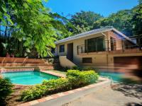 Nestled within the vibrant coastal town of Amanzimtoti, this multi-level residence offers a tranquil retreat on a generous 2452 sqm erf. The property boasts a distinctive design with a light-coloured exterior and a dark tiled roof, set amidst lush, mature tropical landscaping that ensures privacy and a serene atmosphere. Large sliding doors facilitate a seamless transition from the interior living spaces to the expansive outdoor areas, embracing the South African indoor-outdoor lifestyle.
