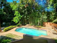 Outdoor living is a highlight, with a private swimming pool serving as the centrepiece of the tropical garden. Surrounding the pool, brick paving and a spacious tiled patio provide ideal spots for alfresco dining and leisure. The property also benefits from a substantial four-car garage and five total parking spaces, ensuring convenience for residents and guests. Additional practical features include a laundry room, a guest toilet, domestic rooms, and a secure fence, enhancing the property's functionality and appeal.