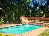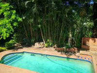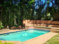 Outdoor living is a highlight, with a private swimming pool serving as the centrepiece of the tropical garden. Surrounding the pool, brick paving and a spacious tiled patio provide ideal spots for alfresco dining and leisure. The property also benefits from a substantial four-car garage and five total parking spaces, ensuring convenience for residents and guests. Additional practical features include a laundry room, a guest toilet, domestic rooms, and a secure fence, enhancing the property's functionality and appeal.