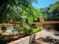 Nestled within the vibrant coastal town of Amanzimtoti, this multi-level residence offers a tranquil retreat on a generous 2452 sqm erf. The property boasts a distinctive design with a light-coloured exterior and a dark tiled roof, set amidst lush, mature tropical landscaping that ensures privacy and a serene atmosphere. Large sliding doors facilitate a seamless transition from the interior living spaces to the expansive outdoor areas, embracing the South African indoor-outdoor lifestyle.