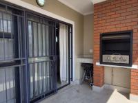 The lounge opens to a covered balcony, featuring a gas braai and scenic estate views—perfect for relaxing evenings or entertaining guests.