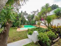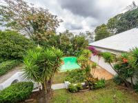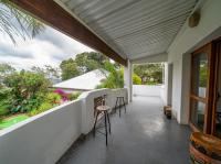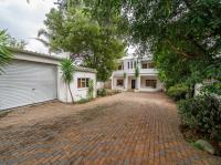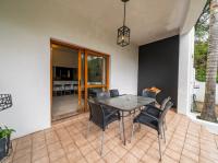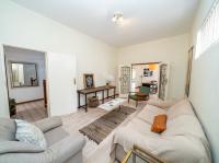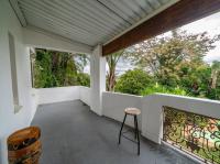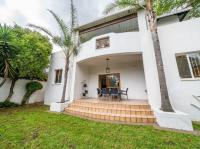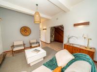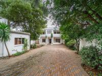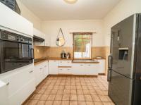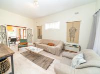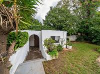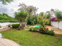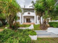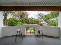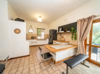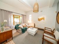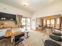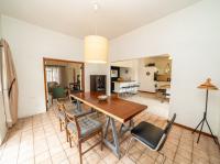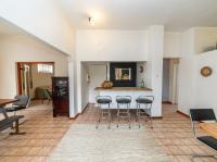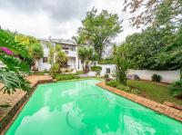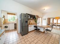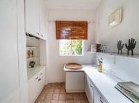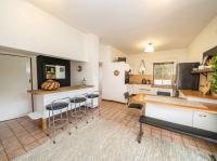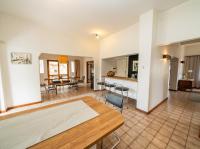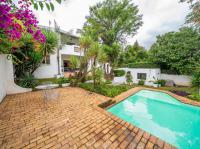 The open-plan kitchen offers ample cupboard space, a breakfast nook, and a scullery with space for two appliances. A bar counter between the kitchen and dining room creates a sociable space perfect for entertaining. From the kitchen, doors lead out to outdoor seating areas overlooking the sparkling swimming pool and well-established garden.