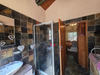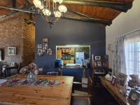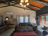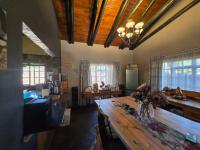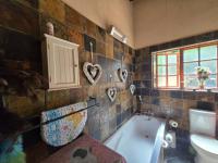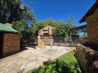 The main house features two bedrooms, a full bathroom, a dining room, and a lounge that flows into an open-plan kitchen with a nook. The home is finished with slate tile flooring throughout, open rafters/bulkhead ceilings, an IBR roof with a wood-finished air ceiling, creating a practical yet attractive living space.