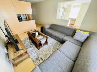 Step inside to an open-plan layout that seamlessly connects the living areas. An entrance hall leads into a spacious lounge and dining room, providing a versatile environment for relaxation and entertaining. The kitchen is functionally designed with wood-toned cabinetry, granite-look countertops, and integrated appliances including an oven, hob, and microwave. A breakfast bar connects the kitchen to the adjacent living space, enhancing the flow and social interaction.