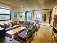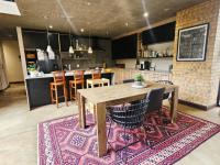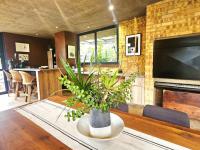 Step inside to a central courtyard garden, creating a tranquil indoor/outdoor connection. An expansive open-plan layout, characterized by soaring ceilings and abundant natural light streaming through large windows and glass doors. The interior showcases a sophisticated industrial-chic aesthetic, featuring exposed concrete ceilings, polished concrete flooring, and elegant brick accent walls. Downstairs you will find a generous open plan lounge, dining, and modern kitchen. All leading through to your spacious entertainment area. The entertainment area boasts a built in braai, built in bar, and has space for a dining room or lounge suite. Stackerdoors open up to your private garden with a sparkling fenced off swimming pool - perfect for entertaining!
