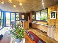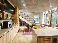 The heart of this home is its modern kitchen, equipped with a large island, dark cabinetry, wooden accents, and high-end appliances, seamlessly flowing into the dining area. This space offers direct access to the unique, verdant central atrium or courtyard garden. Also downstairs you will find your guest bedroom with wheelchair friendly shower only en suite [hidden];