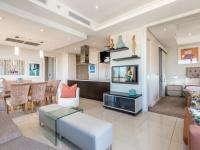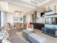 The spacious open-plan lounge and dining area is framed by dramatic floor-to-ceiling windows that flood the apartment with natural light while showcasing spectacular birds-eye views across Sandton and beyond.