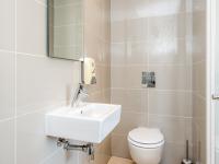 At the heart of the home, a sleek contemporary kitchen features a marble-topped island with prep sink, SMEG oven, stovetop and extractor. A discreet scullery and pantry area houses a SMEG washing machine and dishwasher together with a Samsung fridge-freezer with water dispenser, ensuring the apartment remains both elegant and fully functional. A guest cloakroom adds further convenience.