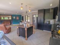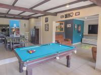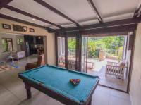 Living areas flow seamlessly. The dining room opens to the snooker area, which connects to the lounge. Large windows fill the space with light, creating a bright, welcoming environment. The open plan kitchen features a centre island, granite countertops, and a gas stove.