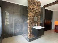 The main bedroom is a highlight, blending rustic charm with modern finishes. Feature brickwork frames the open plan bathroom area. A rustic bath and shower add warmth and texture, while the open layout creates a light, airy atmosphere.