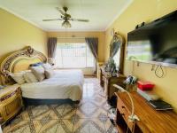 Inside, the home features an open-plan layout that includes a comfortable lounge, a dedicated dining room, and a family TV room, all benefiting from durable tiled flooring. The galley kitchen is both functional and stylish, boasting extensive dark wood-look cabinetry, light speckled countertops, a double sink, and an integrated hob, with natural light streaming in from a window. The two bathrooms are tiled for easy maintenance, with one offering a bathtub and the other a shower.
