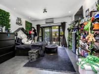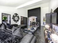 Entering through the oversized front door, a double-volume entrance hall immediately sets the tone for the home’s dramatic architectural style. From here, an elegant archway leads into the spacious TV lounge, where the interplay of light and shadow across the monochrome finishes creates a refined yet comfortable living environment. Adjacent to the lounge, a versatile playroom or bar area is subtly separated by louvered screens, with stacking doors opening directly onto the covered patio and pool terrace, making it ideal for relaxed entertaining.