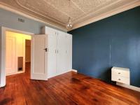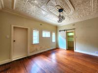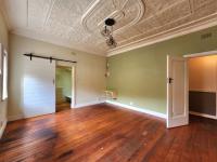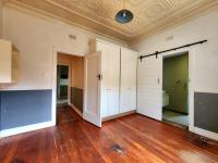 Inside, the residence boasts three bedrooms and three bathrooms, including two en-suite facilities and a convenient guest toilet. The interior reveals character with ornate pressed metal ceilings and original wooden flooring in several areas, offering a glimpse into its potential. The main lounge provides a comfortable living space. The kitchen has been partially modernised with grey cabinetry, a striking red island top, white subway tile backsplash, and contemporary pendant lighting, though some areas require completion and attention to wear.