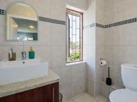 Upstairs offers a practical landing with built-in cupboards. Two well-sized tiled guest bedrooms, both with built-in cupboards, are serviced by a family bathroom with