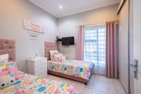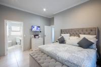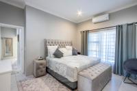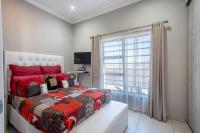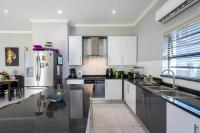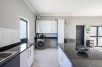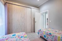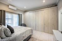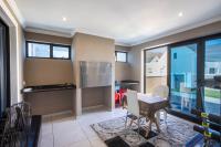 A standout feature is the large braai room, divided from the main living area by sliding glass doors—open it up for one expansive entertainment space, or close it off when you prefer. The stainless-steel braai offers ample wood storage below, with granite prep and serving tops on both sides and plenty of room for seating. Sliding doors lead out to a private, low-maintenance back garden.