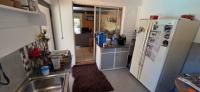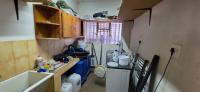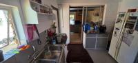 Well-maintained kitchen with ample built-in cupboards and a double sink.