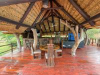 The lodge is thoughtfully positioned to maximise its natural surroundings, featuring a spacious elevated wooden deck with views over a private waterhole regularly visited by wildlife. Additional amenities include a large outdoor swimming pool, pool bar, and a traditional open-air lapa/boma, providing an authentic bushveld hospitality experience.