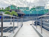 entertainment space located alongside a soccer/sports court, making for a