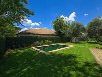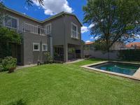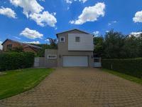 Downstairs, a welcoming entrance hall leads into the open-plan living and dining areas, complemented by a convenient guest toilet. The modern kitchen features granite countertops and a separate scullery. The lounge opens beautifully with stack doors onto a covered patio with a built-in braai, overlooking a spacious garden, sparkling swimming pool, and jungle gym, perfect for family living and entertaining. Additional features include staff quarters and a double automated garage with direct access into the home, all set within a secure and well-maintained estate.