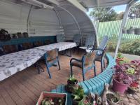 The covered patio overlooks a large private garden—ideal for children and pets.