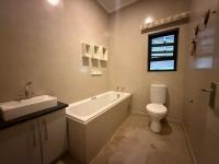 The main bedroom is en-suite and includes built-in cupboards and a ceiling fan. The bathroom is fitted with a shower, basin, and toilet. The second bedroom also features built-in cupboards and a ceiling fan, with a separate second bathroom offering a bath, basin, and toilet.